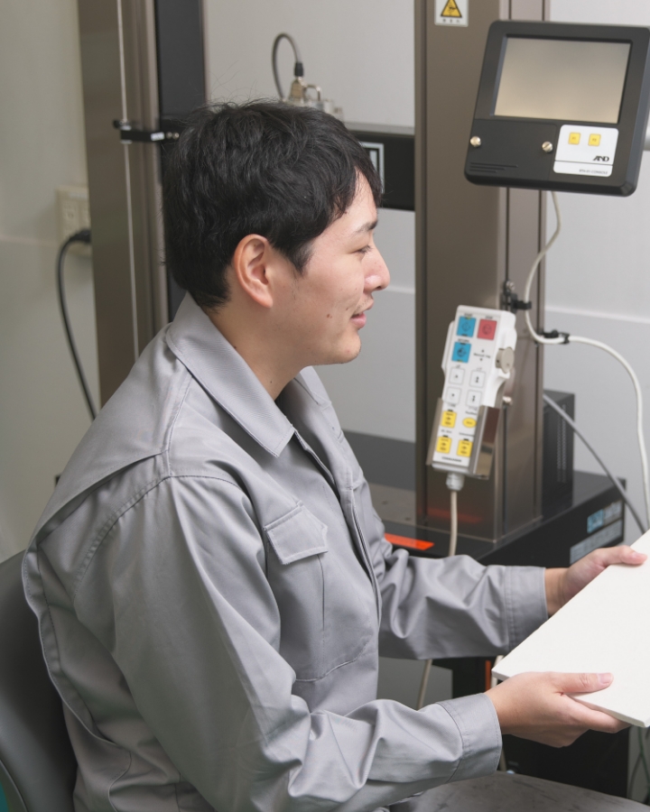 - 開発の仕事を「攻め」とすれば、私たち品質保証は「守り」です。「守り」というと地味に感じるかもしれませんが、常に新しい素材をつくるTOMOEGAWAでは、品質保証の仕事にも「攻め」の要素が強くあります。これまでにない機能を持った開発品をつくる場合、これまでにないつくり方が必要となります。すると、生産を担うマシンが性能ギリギリの運転が求められるケースが出てきます。マシンの運転条件が変わると、品質にも影響がありますから、私たちには品質保証の視点から、「攻め」の姿勢で、考え得る問題点を積極的に指摘することが求められます。